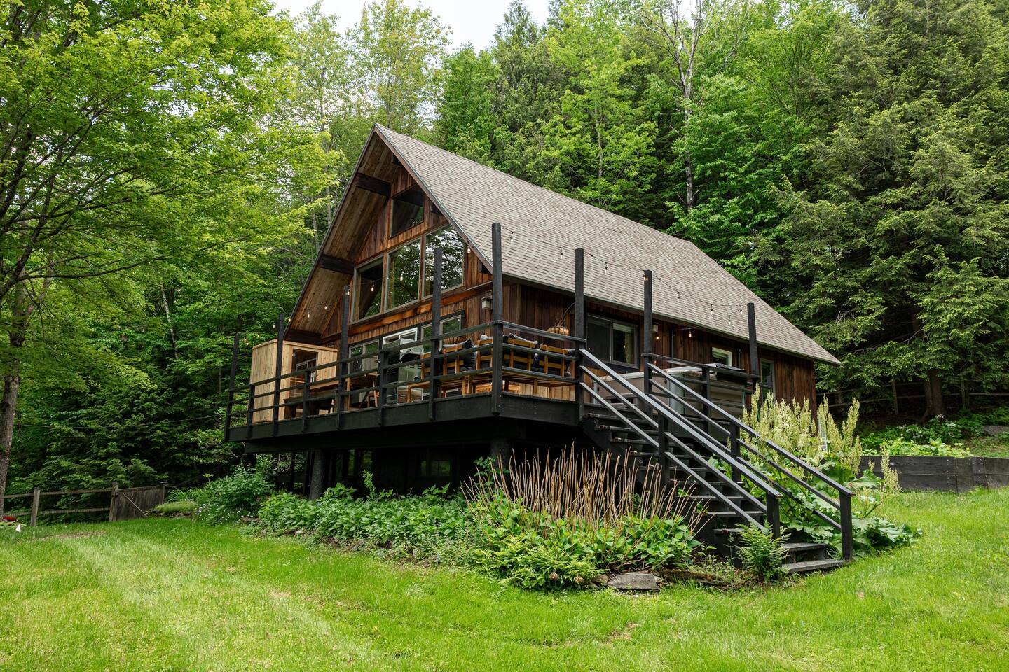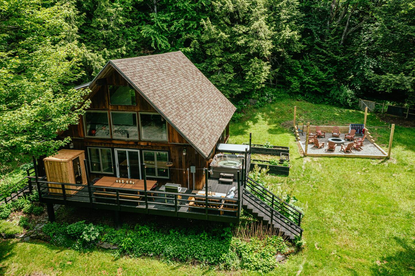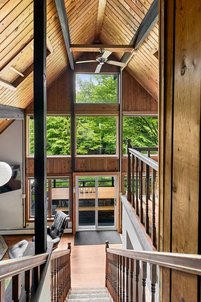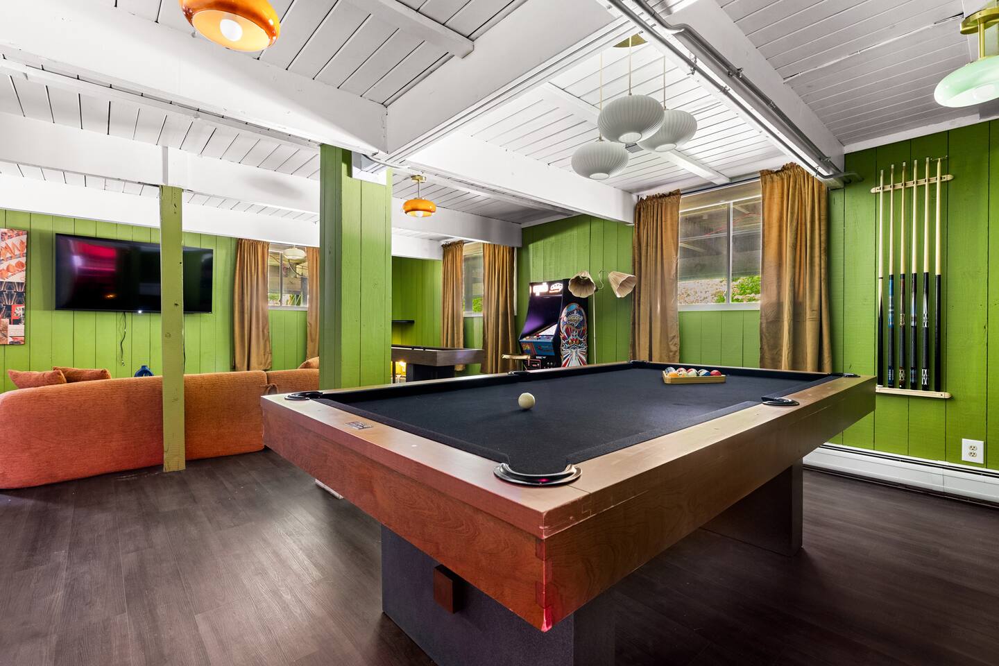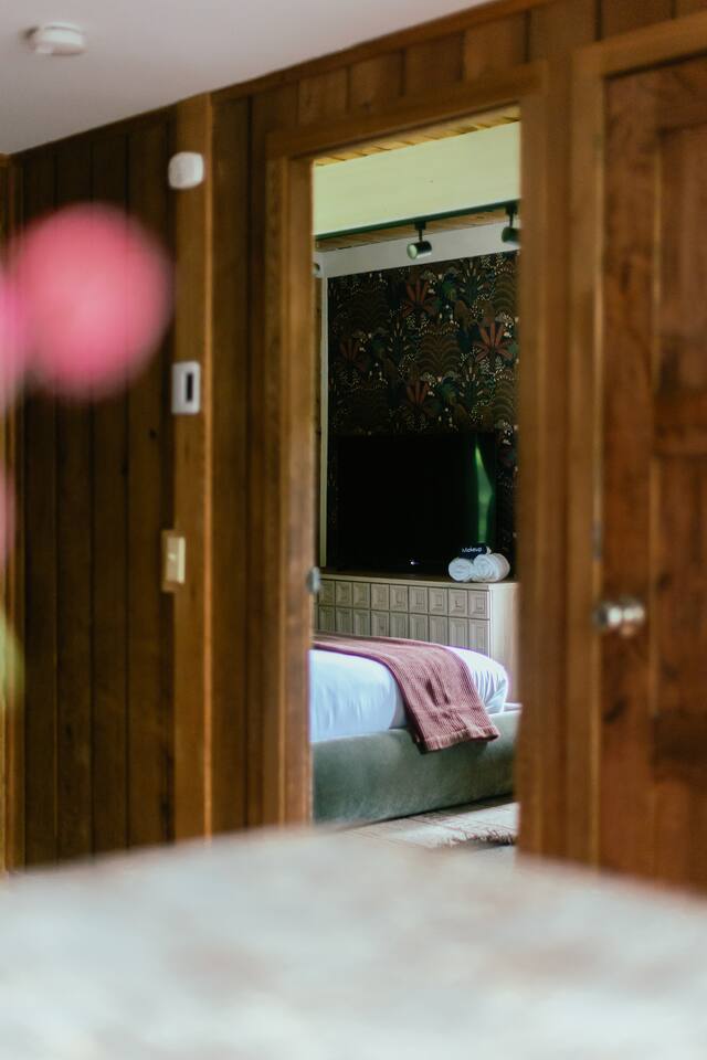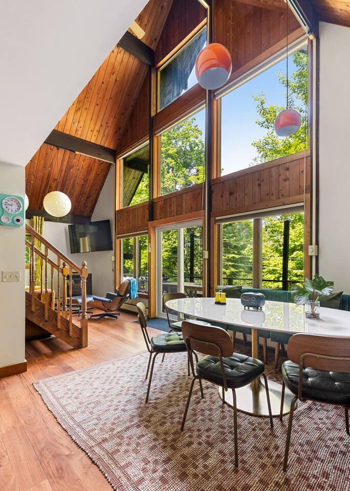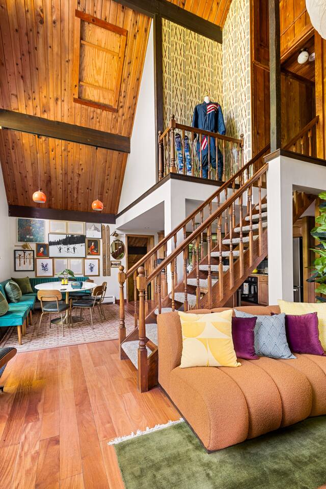 3 Levels 4 Bedroom 9 Beds 2Bath 2,200 sq. ft. The Location: - 2 Miles to Waterbury Reservoir - 7 Miles Gold Brook Covered Bridge - 8 Miles to Downtown Stowe - 13 Miles to Stowe Mountain Resort - 14 Miles to Bolton Valley Resort - 16 Miles Smugglers Notch/MT. Mansfield - 22 Miles to Sugar Bush - 26 Miles (30 Min.) to Burlington, VT Airport The Layout: Top Level- King Bed Master Suite: (Located Up Three Sets of Stairs- 1 set into the cabin, another small set up into the kitchen/main living area, and a final large set up into the master suite) - Private Ensuite Bathroom (Bathroom #1) -Double Vanity - Tub/Shower Combo with Toiletries & Blow Dryer - Spacious Walk-in Closet - Smart TV - Window Wall - Mini-Split for On-Demand Head & AC Main Level- (Located up 12 stairs into the cabin and an additional 5 stairs into the main level from the entry/mud room) - 2 Queen Bedrooms - Bathroom #2 Full bathroom but smaller in size compared to bathroom 1 in the master suite - Fully Stocked Kitchen with Modern Appliances - Coffee Bar with Keurig - Dining Table with Seating for 10 - Kitchen Island with Seating for 2 - Living Room with Comfy Seating & Smart TV - Mini-Split for On Demand Heat & AC - Entryway with Ski & Gear Drop Zone - Neon Sign Welcome Wall (because vibes matter) - Access to Deck with Hot Tub, & Firepit, Grill and Outdoor Seating Queen Bedroom 1: - Plush Queen Bed - Smart TV - Closet Storage - Shared Bathroom Access - Mini-Split for On Demand Heat & AC Queen Bedroom 2: - Plush Queen Bed - Smart TV - Closet Storage - Shared Bathroom Access - Mini-Split for On Demand Heat & AC Lower Level- Game Room: (Located Downstairs) - Pool Table - Classic Pac-Man Arcade Machine - Shuffleboard - 3-in-1 Ping Pong / Foosball / Air Hockey - Board Games for All Ages - Cozy Lounge Area - Large Smart TV for Movie Nights - Fun Retro Décor Throughout - Washer & Dryer - Life Size Games Bunk Room: - 6 Beds (Three Twin/Twin Bunks) - LED Lighting - Smart TV - Cozy Pillows + Optional Floor Seating - Great for Kids, Teens, or the Kid-at-Heart Outdoor Space- - Hot Tub - 2 Person Cedar Sauna (currently unavailable) - Large Firepit with Adirondack Seating for 10 - Outdoor Dining Table Seats 12 - Lounge Area with Cushioned Seating - Grill Station (Propane Provided) - Bistro String Lighting for the Perfect Glow Fully Fenced Yard Around the Entire Chalet - Surrounded by Peaceful Woods for Ultimate Privacy Location: - 2 Miles to Waterbury Reservoir - 7 Miles Gold Brook Covered Bridge - 8 Miles to Downtown Stowe - 13 Miles to Stowe Mountain Resort - 14 Miles to Bolton Valley Resort - 16 Miles Smugglers Notch/MT. Mansfield - 22 Miles to Sugar Bush - 26 Miles (30 Min.) to Burlington, VT Airport Local Attractions Within Minutes: - World-Class Skiing & Snowboarding - Mountain Biking & Scenic Hiking Trails - Fishing, Swimming & Kayaking - Local Shops, Coffee Houses & Bakeries - World Class Eateries - Ben & Jerry’s Factory - Golfing - Breweries, Wineries & Cideries - Art Galleries & Antique Stores - Spas & Wellness Centers - Live Music & Community Events Whether you’re chasing fresh powder, sipping cider downtown, exploring northern Vermonts amazing fall foliage or soaking in the hot tub under the stars — The 1976 offers the perfect blend of laid-back luxury and retro charm. Every inch was designed to be both eye-catching and cozy, giving you that IG-worthy escape with all the comforts of home. Ideal for families, multiple families traveling together, or adult friend groups, the layout gives everyone space to spread out. With bedrooms on every level, a game room that keeps all ages entertained, and outdoor areas made for making memories, your Vermont getaway starts here. No pets allowed due to a sever pet allergy. *Pellet stove in the living room has been kept in the room for aesthetics but is no longer functional. It was a main heat source for the home for many years but we have installed AC/Heat mini splits in the living room as well as the bedrooms to keep heating and cooling the cabin more customizable and stress free.
