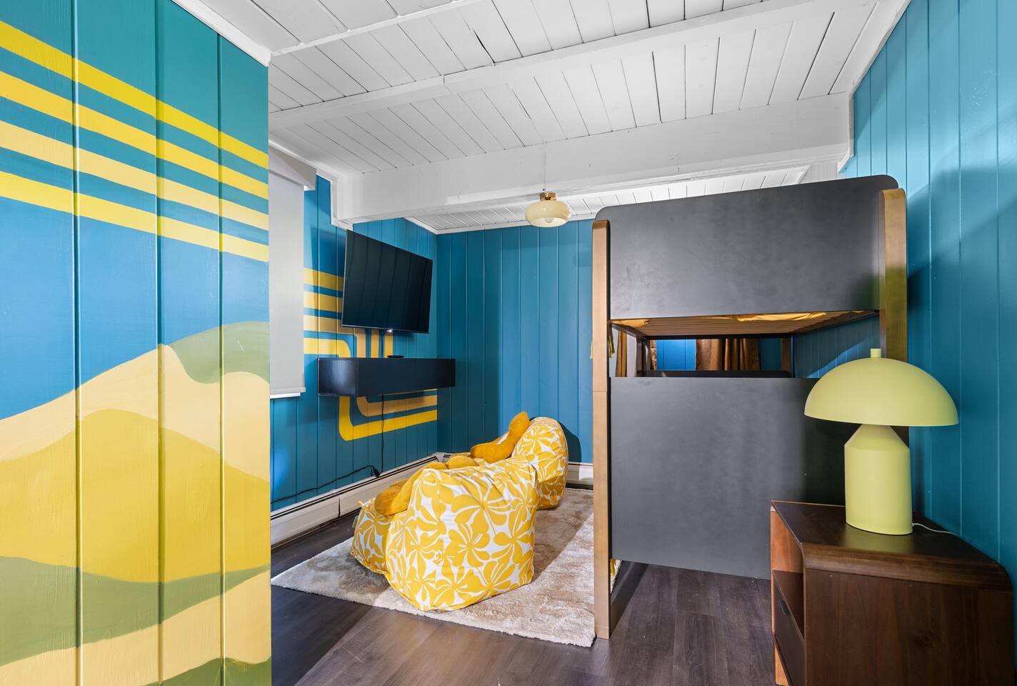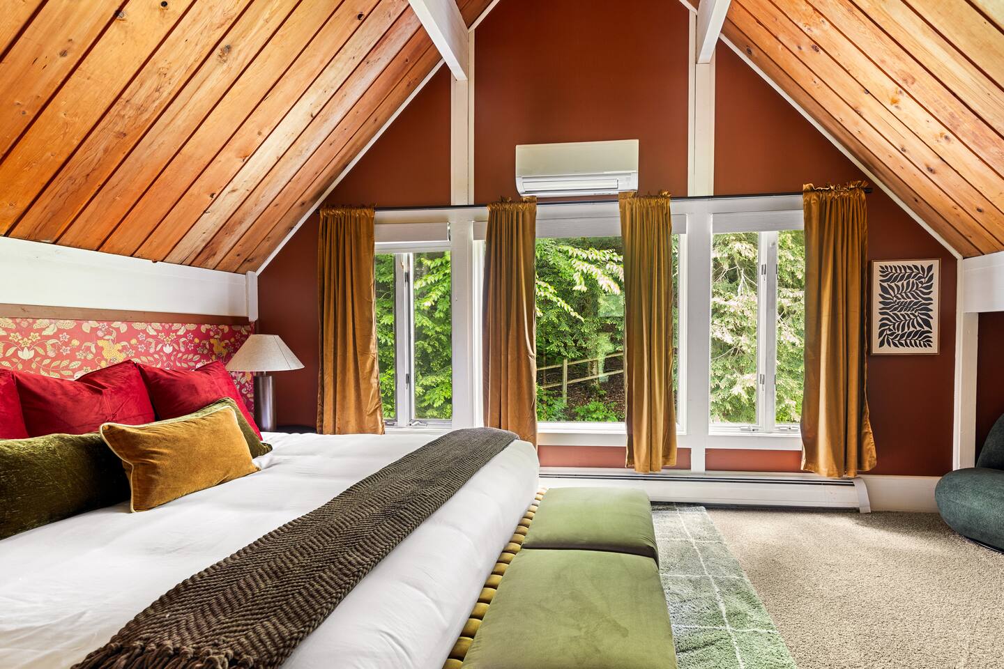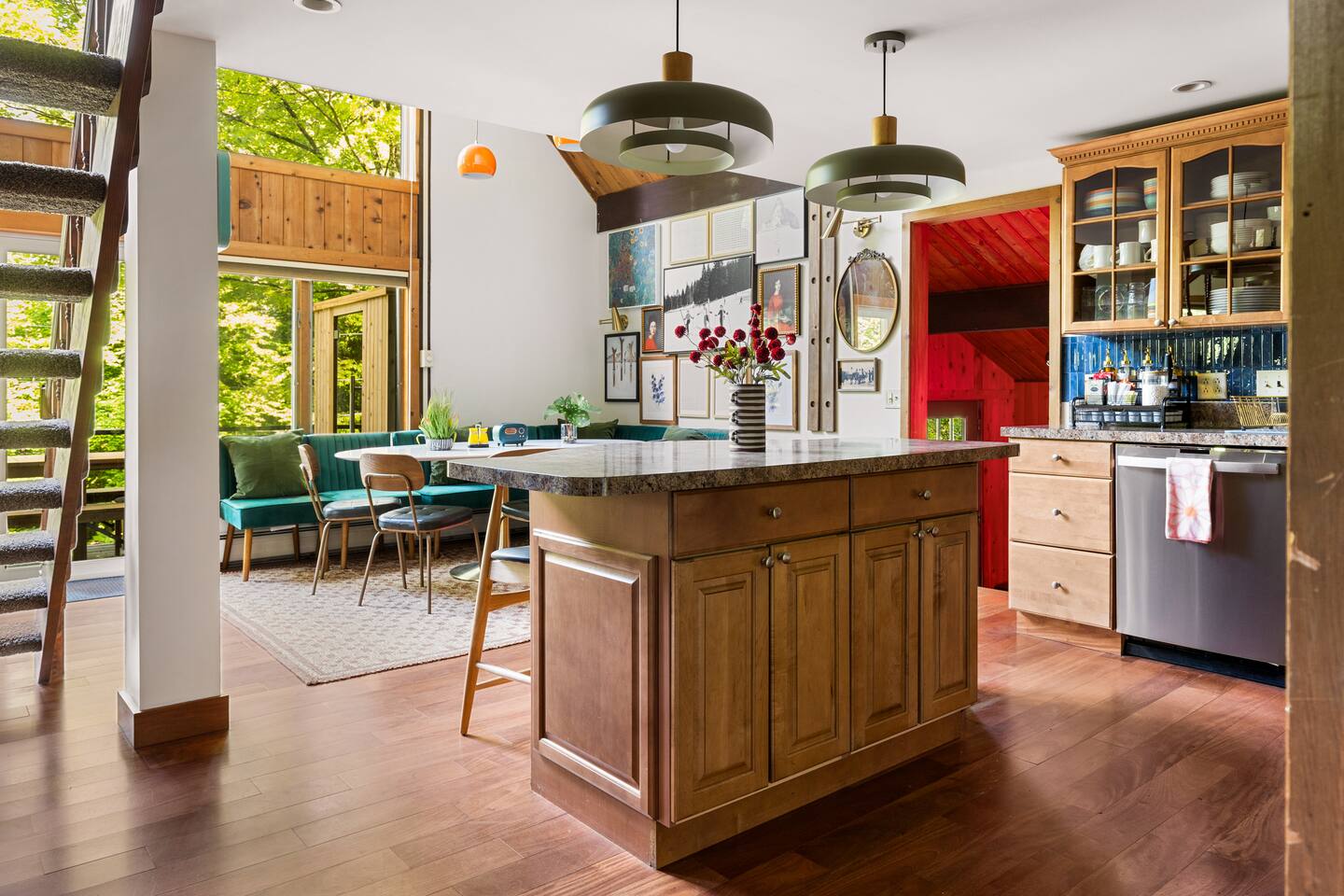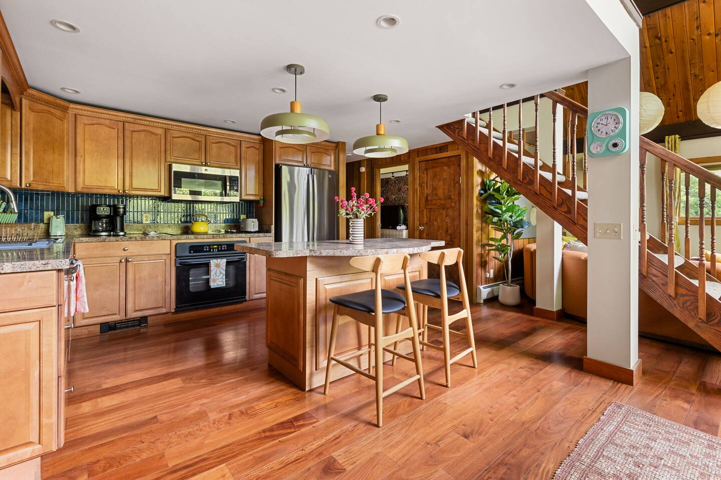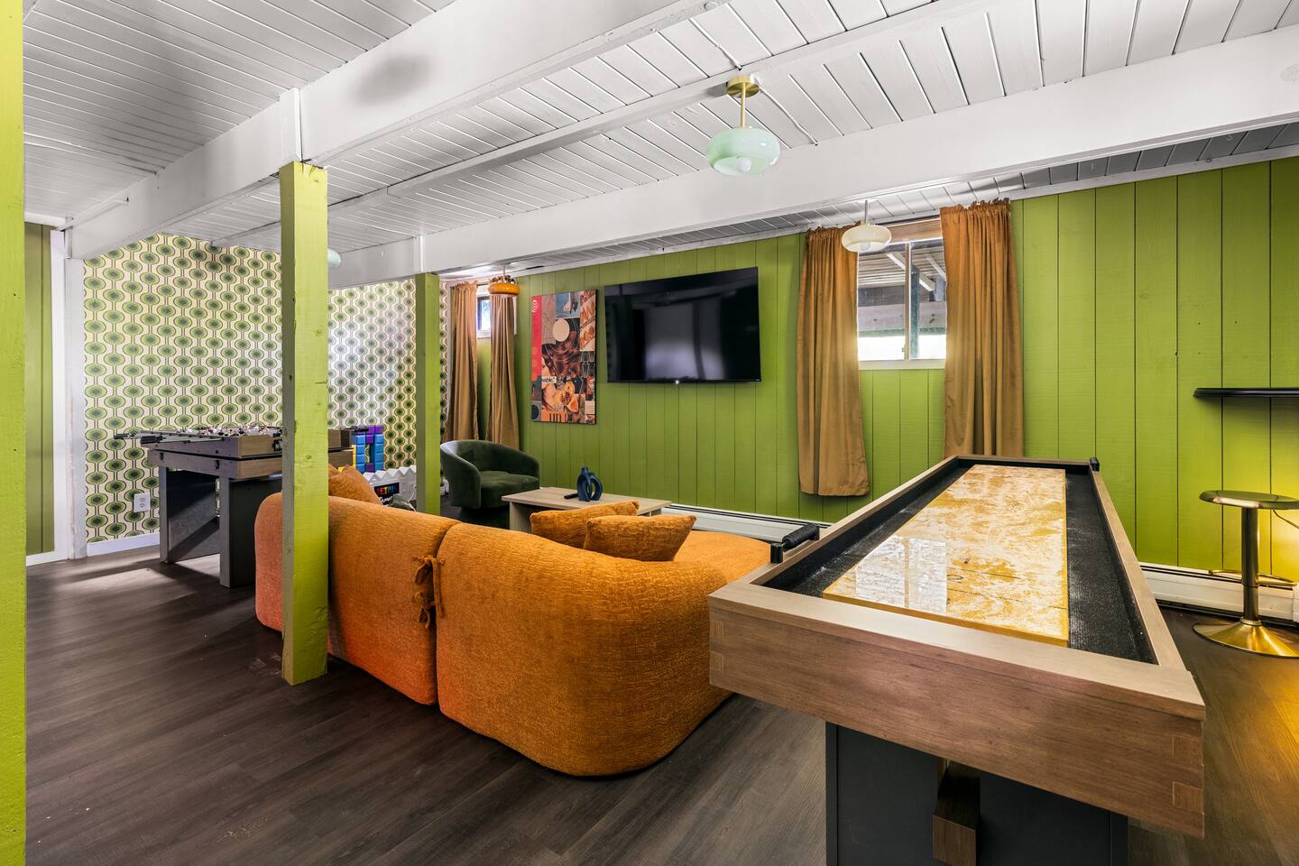 3 Levels 4 Bedroom 9 Beds 2Bath 2,200 sq. ft. The Location: - 2 Miles to Waterbury Reservoir - 7 Miles Gold Brook Covered Bridge - 8 Miles to Downtown Stowe - 13 Miles to Stowe Mountain Resort - 14 Miles to Bolton Valley Resort - 16 Miles Smugglers Notch/MT. Mansfield - 22 Miles to Sugar Bush - 26 Miles (30 Min.) to Burlington, VT Airport The Layout: Top Level- King Bed Master Suite: (Located Up Three Sets of Stairs- 1 set into the cabin, another small set up into the kitchen/main living area, and a final large set up into the master suite) - Private Ensuite Bathroom (Bathroom #1) -Double Vanity - Tub/Shower Combo with Toiletries & Blow Dryer - Spacious Walk-in Closet - Smart TV - Window Wall - Mini-Split for On-Demand Head & AC Main Level- (Located up 12 stairs into the cabin and an additional 5 stairs into the main level from the entry/mud room) - 2 Queen Bedrooms - Bathroom #2 Full bathroom but smaller in size compared to bathroom 1 in the master suite - Fully Stocked Kitchen with Modern Appliances - Coffee Bar with Keurig - Dining Table with Seating for 10 - Kitchen Island with Seating for 2 - Living Room with Comfy Seating & Smart TV - Mini-Split for On Demand Heat & AC - Entryway with Ski & Gear Drop Zone - Neon Sign Welcome Wall (because vibes matter) - Access to Deck with Hot Tub, & Firepit, Grill and Outdoor Seating Queen Bedroom 1: - Plush Queen Bed - Smart TV - Closet Storage - Shared Bathroom Access - Mini-Split for On Demand Heat & AC Queen Bedroom 2: - Plush Queen Bed - Smart TV - Closet Storage - Shared Bathroom Access - Mini-Split for On Demand Heat & AC Lower Level- Game Room: (Located Downstairs) - Pool Table - Classic Pac-Man Arcade Machine - Shuffleboard - 3-in-1 Ping Pong / Foosball / Air Hockey - Board Games for All Ages - Cozy Lounge Area - Large Smart TV for Movie Nights - Fun Retro Décor Throughout - Washer & Dryer - Life Size Games Bunk Room: - 6 Beds (Three Twin/Twin Bunks) - LED Lighting - Smart TV - Cozy Pillows + Optional Floor Seating - Great for Kids, Teens, or the Kid-at-Heart Outdoor Space- - Hot Tub - 2 Person Cedar Sauna (currently unavailable) - Large Firepit with Adirondack Seating for 10 - Outdoor Dining Table Seats 12 - Lounge Area with Cushioned Seating - Grill Station (Propane Provided) - Bistro String Lighting for the Perfect Glow Fully Fenced Yard Around the Entire Chalet - Surrounded by Peaceful Woods for Ultimate Privacy Location: - 2 Miles to Waterbury Reservoir - 7 Miles Gold Brook Covered Bridge - 8 Miles to Downtown Stowe - 13 Miles to Stowe Mountain Resort - 14 Miles to Bolton Valley Resort - 16 Miles Smugglers Notch/MT. Mansfield - 22 Miles to Sugar Bush - 26 Miles (30 Min.) to Burlington, VT Airport Local Attractions Within Minutes: - World-Class Skiing & Snowboarding - Mountain Biking & Scenic Hiking Trails - Fishing, Swimming & Kayaking - Local Shops, Coffee Houses & Bakeries - World Class Eateries - Ben & Jerry’s Factory - Golfing - Breweries, Wineries & Cideries - Art Galleries & Antique Stores - Spas & Wellness Centers - Live Music & Community Events Whether you’re chasing fresh powder, sipping cider downtown, exploring northern Vermonts amazing fall foliage or soaking in the hot tub under the stars — The 1976 offers the perfect blend of laid-back luxury and retro charm. Every inch was designed to be both eye-catching and cozy, giving you that IG-worthy escape with all the comforts of home. Ideal for families, multiple families traveling together, or adult friend groups, the layout gives everyone space to spread out. With bedrooms on every level, a game room that keeps all ages entertained, and outdoor areas made for making memories, your Vermont getaway starts here. No pets allowed due to a sever pet allergy. *Pellet stove in the living room has been kept in the room for aesthetics but is no longer functional. It was a main heat source for the home for many years but we have installed AC/Heat mini splits in the living room as well as the bedrooms to keep heating and cooling the cabin more customizable and stress free.